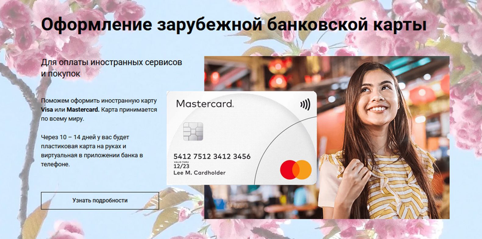 Среди предоставляемых услуг – оформление карты МастерКард или Виза. Такие платежные средства будут приниматься в любой стране мира, что позволяет обойти существующие блокировки. На получение карты требуется 10-14 дней, клиенту выдается пластик и оформляется виртуальный счет в мобильном приложении.