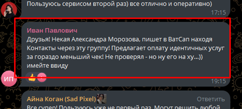 На канале с отзывами иногда публикуется важная для клиентов информация. Например, один из пользователей написал, что с ним связалась Александра Морозова и предложила оплату сервисов за меньшую сумму. Контакты она взяла из группы.