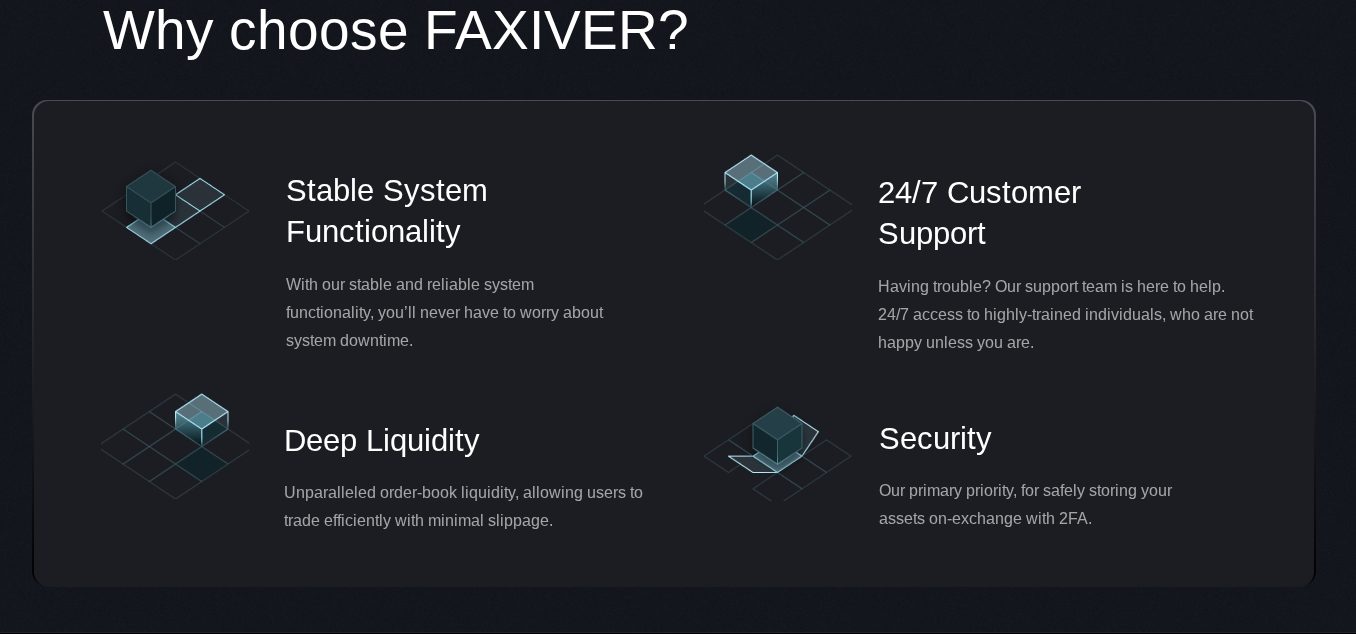 На сайте платформы по инвестициям менеджеры проекта активно прогревают аудиторию и пытаются побудить ее к сотрудничеству. Сразу на главной странице разработчики утверждают про быструю покупку и продажу криптовалют. Кроме этого, создатели обменника «Факсивер» обещают еще сниженные комиссии.