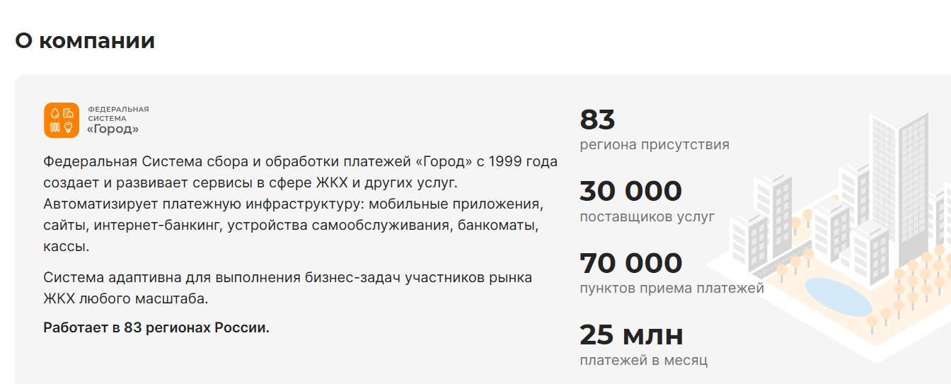 “Город” это крупная, давно существующая платежная инфраструктура, без которой в ряде регионов оплата услуг ЖКХ просто невозможна.
