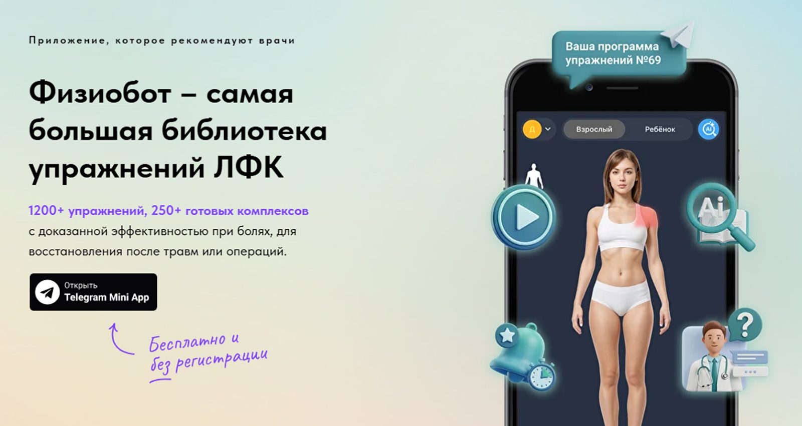 «Физиобот» – хороший проект для поддержания здоровья, в котором собрано свыше 1000 лечебных программ. Пользоваться ботом можно абсолютно бесплатно, но настоятельно рекомендуем перед выбором программы проконсультироваться с вашим лечащим врачом.