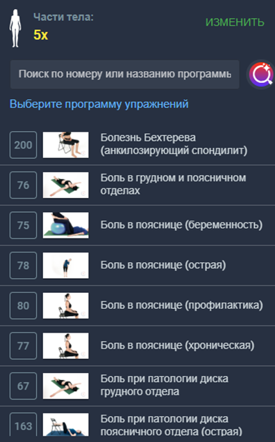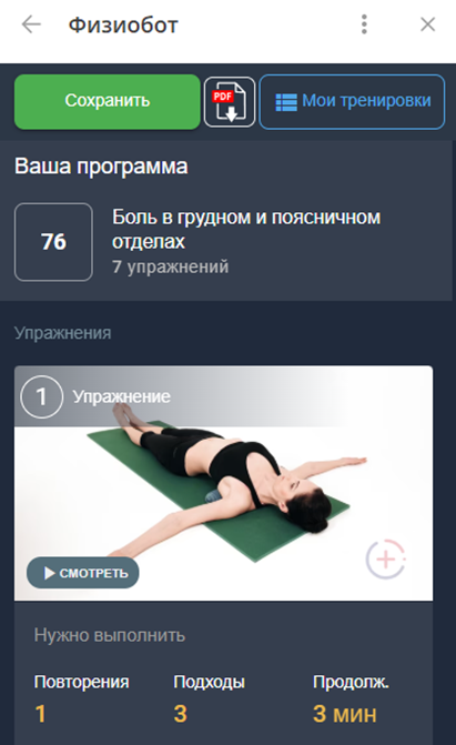 Перечень программ с симптомами и диагнозом появляется в виде списка. То есть мало просто выбрать в тг «Физиобот» для шеи, нужно понимать, какие именно у вас симптомы и диагноз.