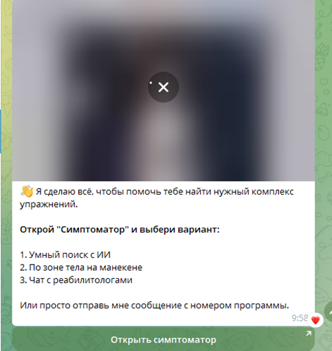 Физио бот из телеграм-канала использовать очень просто. После запуска пользователь должен выбрать предпочтительный вариант поиска комплекса упражнения. Это может быть симптоматор, работающий с ИИ, просто нужная для проработки часть тела на манекене или же живой чат с реабилитологом.