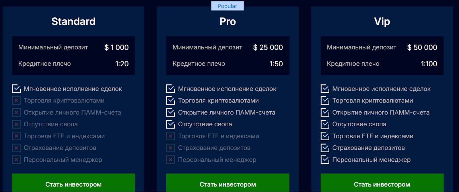 • Standard – стартовый аккаунт с минимальным депозитом 1000 долларов и кредитным плечом 1:100, сделки выполняются мгновенно;