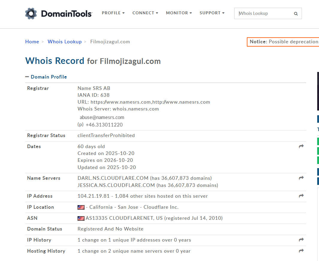 Сам домен filmojizagul com был зарегистрирован 20 октября 2025 г. через Name SRS AB, использовалась защита персональных данных. Ничего криминального в самом хостинге или инфраструктуре не было, но и ничего, что добавляло бы доверия, тоже.