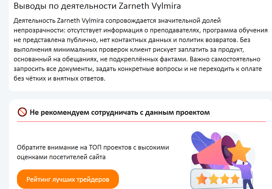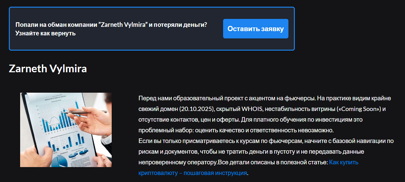 Перед нами образовательный проект по трейдингу Zarneth Vylmira, который презентовал себя как центр знаний по фьючерсной торговле и обещал обучение для тех, кто хочет зарабатывать на деривативах.