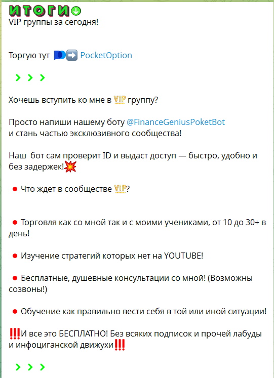 В одном из своих постов автор сообщал, что брокер, у которого следует зарегистрироваться — это сомнительная биржа бинарных опционов PocketOption. Контора известна многим как мошенническая, трейдеры часто жалуются на невозврат средств с торгового депозита. Согласно их отзывам, данная площадка крадет все деньги, которые пользователи кладут для заключения сделок. Оформить вывод практически невозможно.
