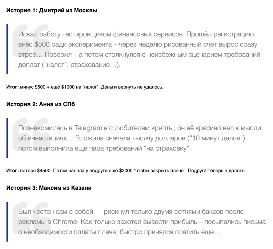 Если хотите узнать больше о том, как скамеры разводят новичков в инвестировании на деньги, тогда читайте обзоры у нас на сайте. В них содержатся исчерпывающие сведения об актуальных на 2026-ой год схемах лохотронов.