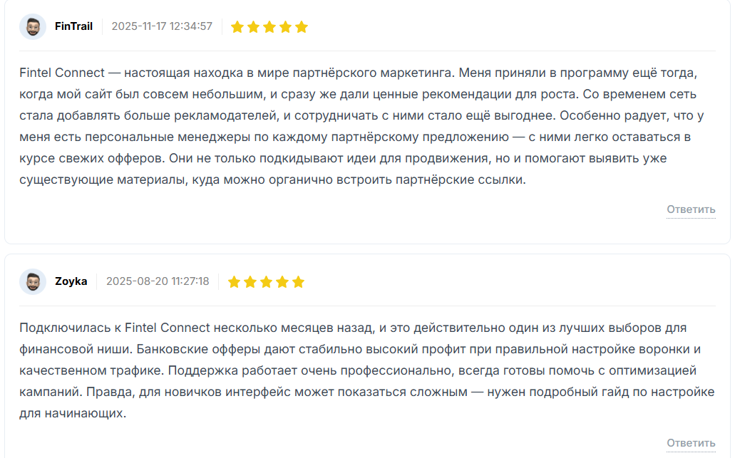 Отзывы о Fintel Connect на ноябрь 2025 года носят противоречивый характер. Положительные оценки качества обслуживания можно обнаружить как на самом сайте проекта, так и в других открытых источниках. Пользователи утверждают, что банковские офферы дают стабильно высокий профит. Единственная оговорка – на прибыль влияет правильность настройки воронки и качество трафика. Среди плюсов также отмечают оперативность и профессионализм саппорта. Интерфейс – незначительный, но недостаток компании. Пользователи считают, что для новичков нужен подробный гайд.