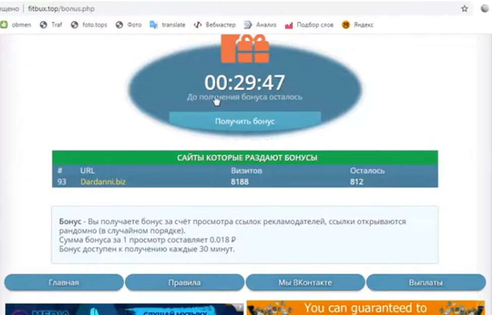 Все задания расположены на главной странице: по суммам бонусов справа видно, что больше 4 копеек за посещение не предусмотрено. Чтобы накопить хотя бы рубль придется просмотреть около 30 сайтов. Хоть в этом и нет ничего сложного, однако юзер должен находится на площадке определенное время.