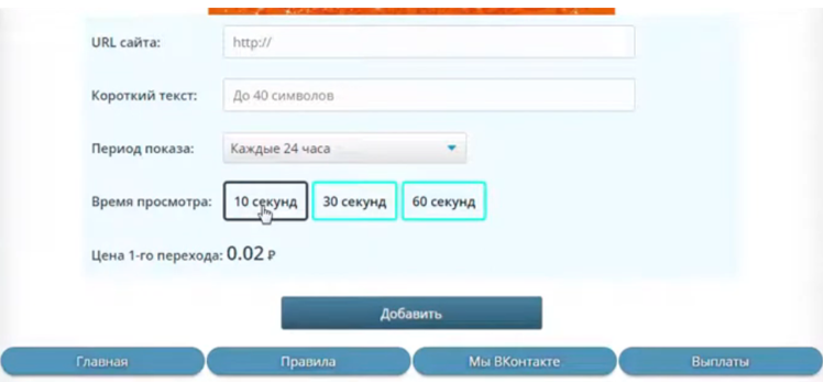 Организаторы сервиса предлагали заказчикам создавать объявления с собственными сайтами, а исполнителям переходить по ним и зарабатывать деньги за счет генерации трафика. Компания, конечно, брала комиссию и себе, но ее размеры сейчас неизвестны. Ниже видно, как выглядело окно для оформления собственного заказа: необходимо было вставить ссылку на свою платформу, указать время посещения и оплату за переход. Она здесь составляла буквально несколько копеек, т.е. заработать что-то значительное на серфинге было невозможно.