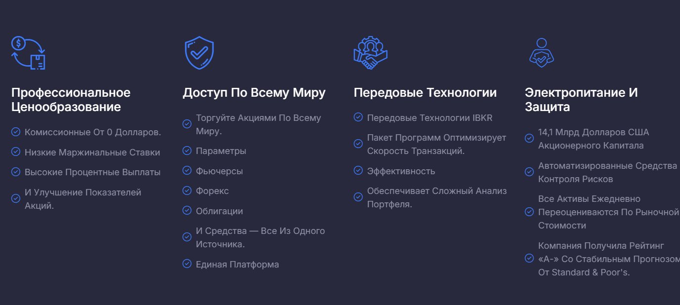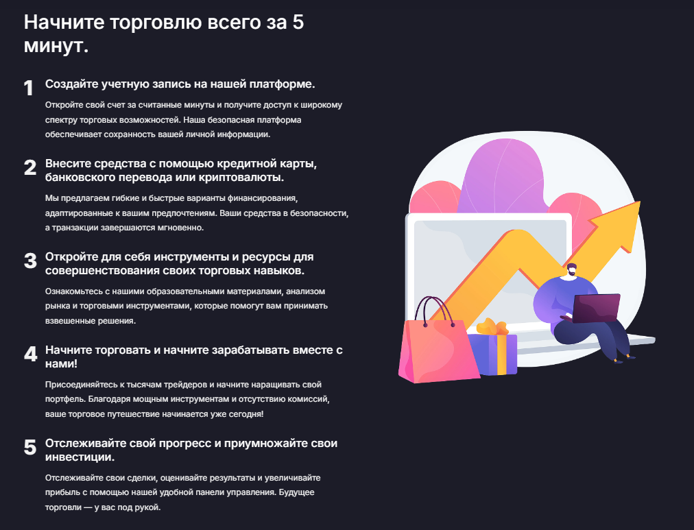 Сайт оформлен только на английском языке, возможность выбора языка отсутствует. При переводе раздел с преимуществами кажется набором слов, но общий посыл понятен: владельцы уверяют в выгодной, безопасной и быстрой торговле активами.