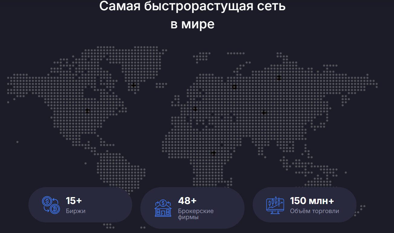 Также владельцы уверяют, что это самая быстрорастущая сеть в мире, которая сотрудничает более чем с 15 биржами и 48 брокерскими компаниями. Указано, что она имеет торговый оборот свыше 150 000 000, но не уточняется, в какой валюте и за какой период.