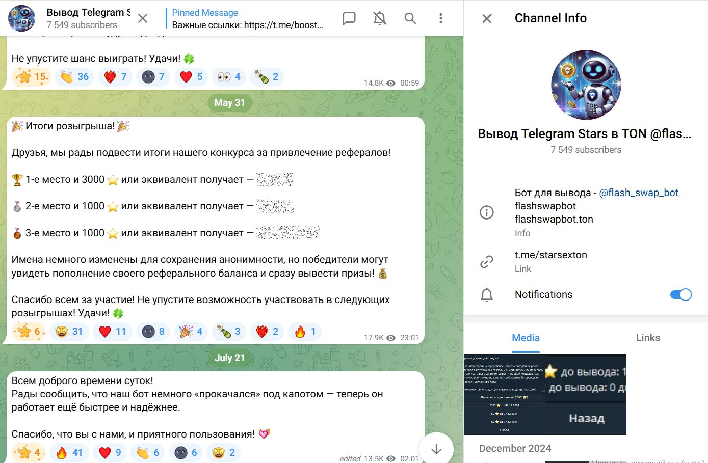 Проект flashswapbot ton существует около года. Первые транзакции в нем начались в декабре 2024 года. Сейчас бот показывает неплохую статистику активности и количества операций. В официальном телеграм-канале «Вывод Telegram Stars в TON» — starsexton на сегодня 7,5 тысяч пользователей. Аудитория довольно активная, хоть сообщество и не публикует посты часто. Тем не менее, публикации набирают по 14-18 тысяч просмотров. Это хороший показатель, говорит он о том, что у проекта действительно есть заинтересованная публика. В ленте в основном объявления о вышедших обновлениях программы, а также анонсы конкурсов для пользователей.