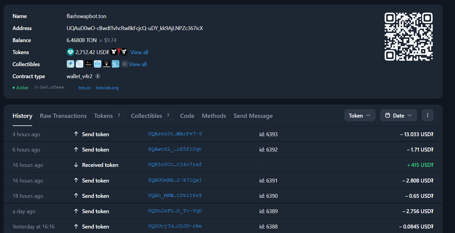 Flash swap bot действует полностью анонимно, разработчики своих имен не раскрывают. Единственное, что известно – это адрес кошелька, к которому прикреплен домен FlashSwapbot ton. Это дает возможность проверить его в обозревателе блокчейна. Анализ показал, что с кошелька действительно регулярно осуществляются мелкие переводы и порой попадаются крупные операции. В общем, деятельность действительно ведется.