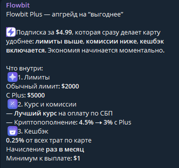 Пополнение карты Flowbit pay доступно через СБП и криптовалюту. Комиссия за пополнение криптой – 4.5%, за транзакцию по карте – $0.25. Перевод между пользователями через FlowID бесплатный, по номеру карты – 1% плюс $1.