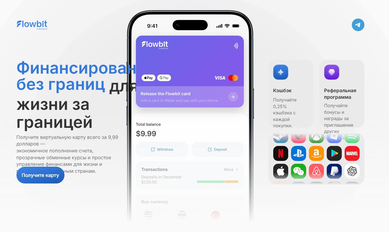 Flowbit Finance – сервис виртуальных карт для оплаты зарубежных сервисов и покупок за границей через Apple Pay и Google Pay. В статье проверим домен и регистрацию, разберем тарифы и условия, посмотрим на бота в Телеграмме и изучим отзывы клиентов.