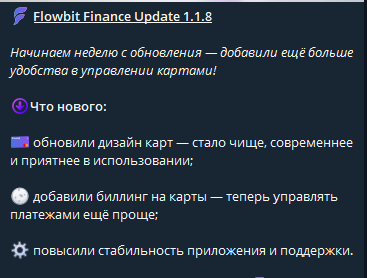 Обновления «Фловбит Финанс» выходят регулярно: создатели исправляют баги, добавляют новые функции и описывают изменения в тарифах. Это говорит о том, что проект активно развивается, а не брошен после запуска.