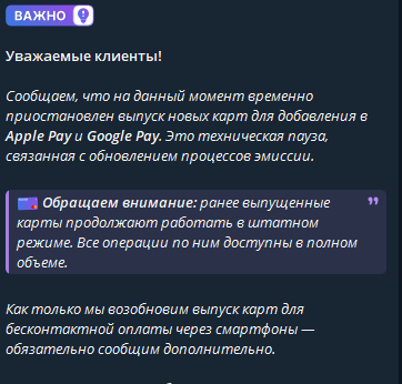 27 марта 2026 года создатели объявили о временной приостановке выпуска NFC-карт для Apple Pay и Google Pay – без указания сроков возобновления.