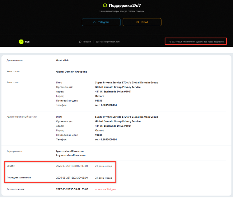 В «подвале» сайта написано, что он работает с 2024 года, но на практике эта информация оказывается ложной, так как в отчете о Whois датой регистрации домена числится март 2026-го. У проекта не было другого адреса, а его название и логотип практически нигде не фигурируют, поэтому все указывает на недавнее появление сервиса на просторах сети.