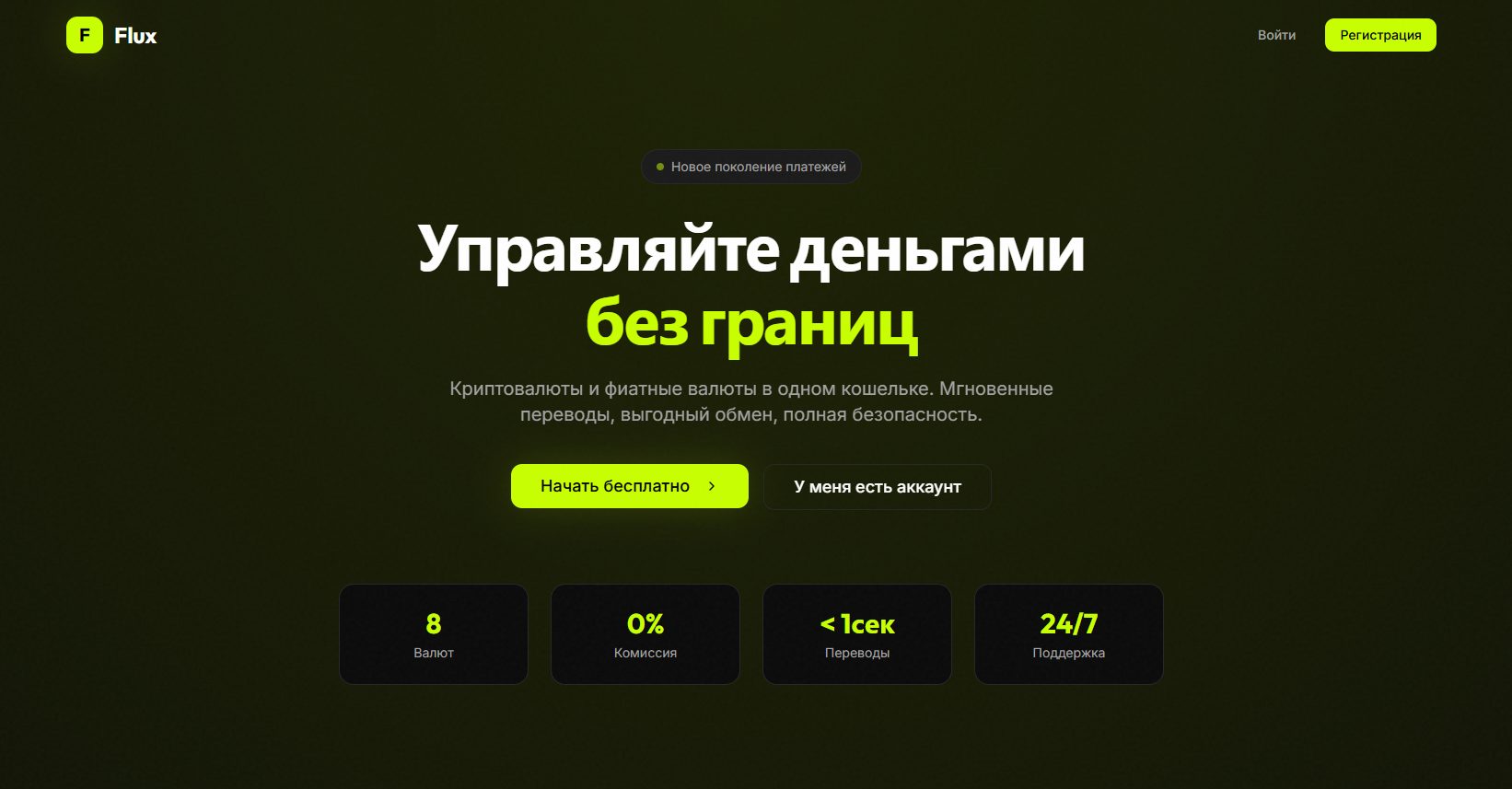 Эта платежная система работает только через сайт Flux4 click, так как в рамках системы нет мобильного приложения, ботов или других порталов. Посадочная страница ресурса оформлена крайне просто и, по сути, является одностраничником, где пользователю очень кратко разъясняют правила сервиса и описывают его преимущества.