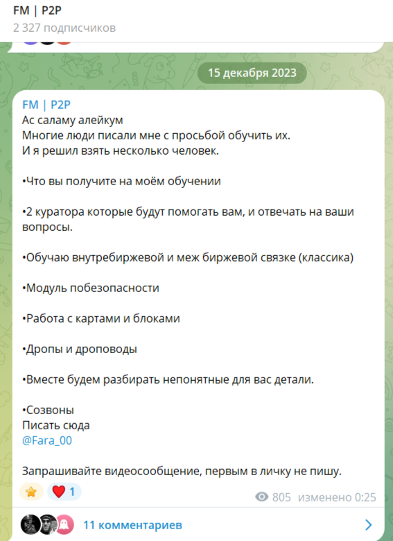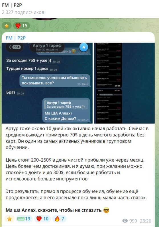Мы провели детальный анализ деятельности трейдера Fara 00 и его телеграм-канала FM P2P. Блогер активно привлекает пользователей пройти онлайн-обучение. Но в его работе выявлены некоторые признаки мошенничества: