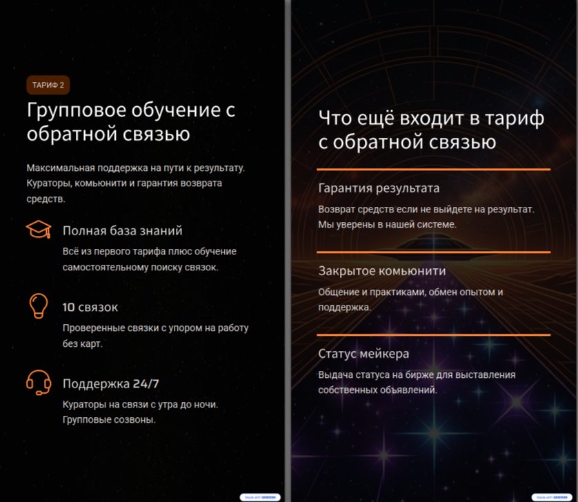 - групповое обучение с возможностью обратной связи. Кроме полной базы данных, сюда также входят 10 связок и круглосуточная поддержка куратора. Стоимость курса – 60 тысяч рублей;