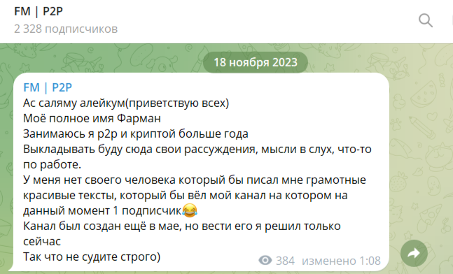 Проект FarmanP2P обосновался и ведет свою деятельность исключительно в мессенджере Телеграм. Канал функционирует более двух лет. Создан FM P2P 23 мая 2023 года. Первые посты появились на канале спустя два месяца. И только в ноябре 2023 блогер начал публиковать сообщения на регулярной основе.