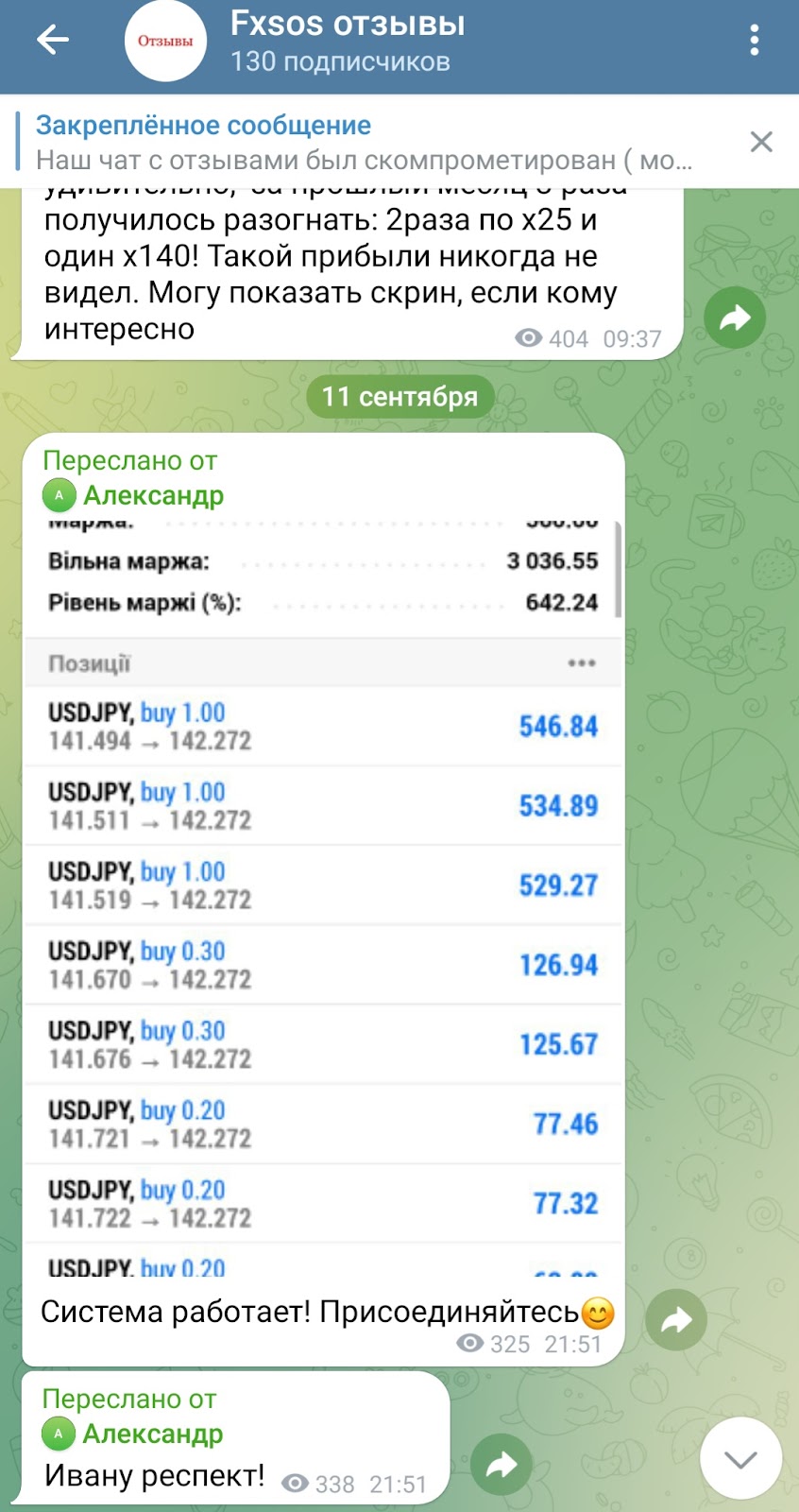 На своем канале Иван Халамендик периодически публикует отзывы клиентов. Дополнительно создал chat Fxsos, в котором можно ознакомиться с мнением подписчиков. В ленте не было найдено негативных высказываний.