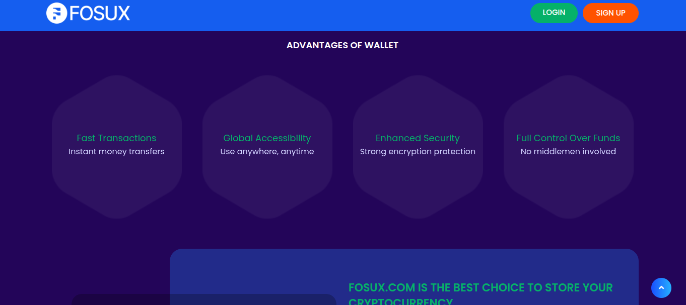 Второй блок с преимуществами частично повторяет предыдущий. Из уникальных нюансов есть утверждение про низкую стоимость транзакций. Благодаря ускоренной обработке, комиссии за конвертацию активов и перевод средств снижены. Следующий нюанс — возможность упрощенной покупки Bitcoin за счет прямого доступа. К тому же, у криптокошелька Fosux com есть еще p2p.