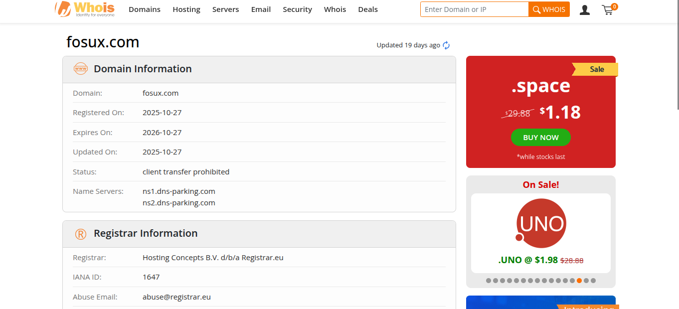 Для сбора информации наша редакция комплексно проверила криптовалютный кошелек Fosux com. Анализ по сервису WHOIS показал, что биржа по конвертации активов стартовала 27.10.2025 года. Это значит, что проекту чуть меньше 3 месяцев, поэтому про лидерство в сфере блокчейна авторы платформы соврали.