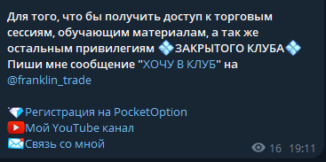 Канал активно продвигает платный закрытый клуб для подписчиков. Для вступления нужно написать автору личное сообщение. Стоимость участия при этом скрыта от посторонних глаз. Весь бесплатный контент служит воронкой для привлечения в платный клуб. Также автор настойчиво предлагает регистрацию на платформу PocketOption через свою реферальную ссылку. Это значит, что он дополнительно зарабатывает деньги на привлечении новых клиентов на биржу.