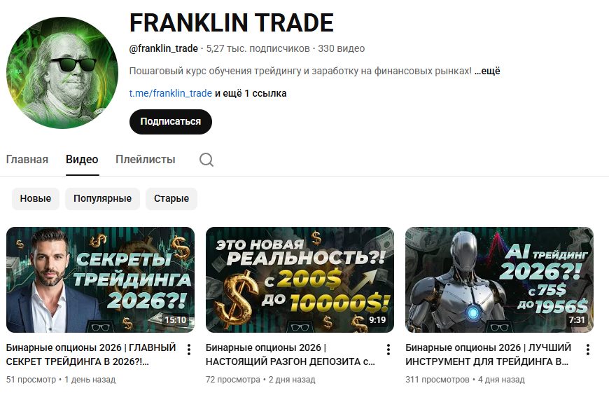 Помимо этого он развивает YouTube-канал. У него 5270 подписчиков и 330 загруженных роликов. Однако просмотры при этом очень низкие. Последние видео набирают всего от 50 до 300 просмотров. Для канала с такой долгой историей статистика откровенно слабая. Опытный и известный трейдер собирал бы куда больше аудитории.