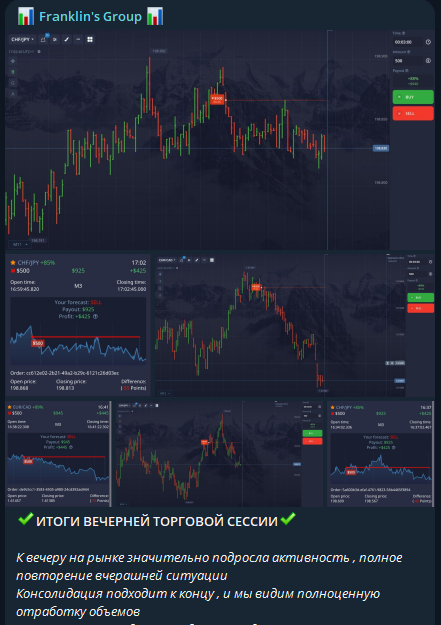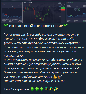 Основной контент канала Franklins Group – ежедневные отчеты о торговых сессиях. Автор публикует итоги дневных и вечерних торгов каждый будний день. В каждом посте он демонстрирует исключительно положительный результат. Типичный отчет выглядит так: «3 из 4 закрыли в плюс». Или еще лучше: «4 из 4 сделок успешный исход».