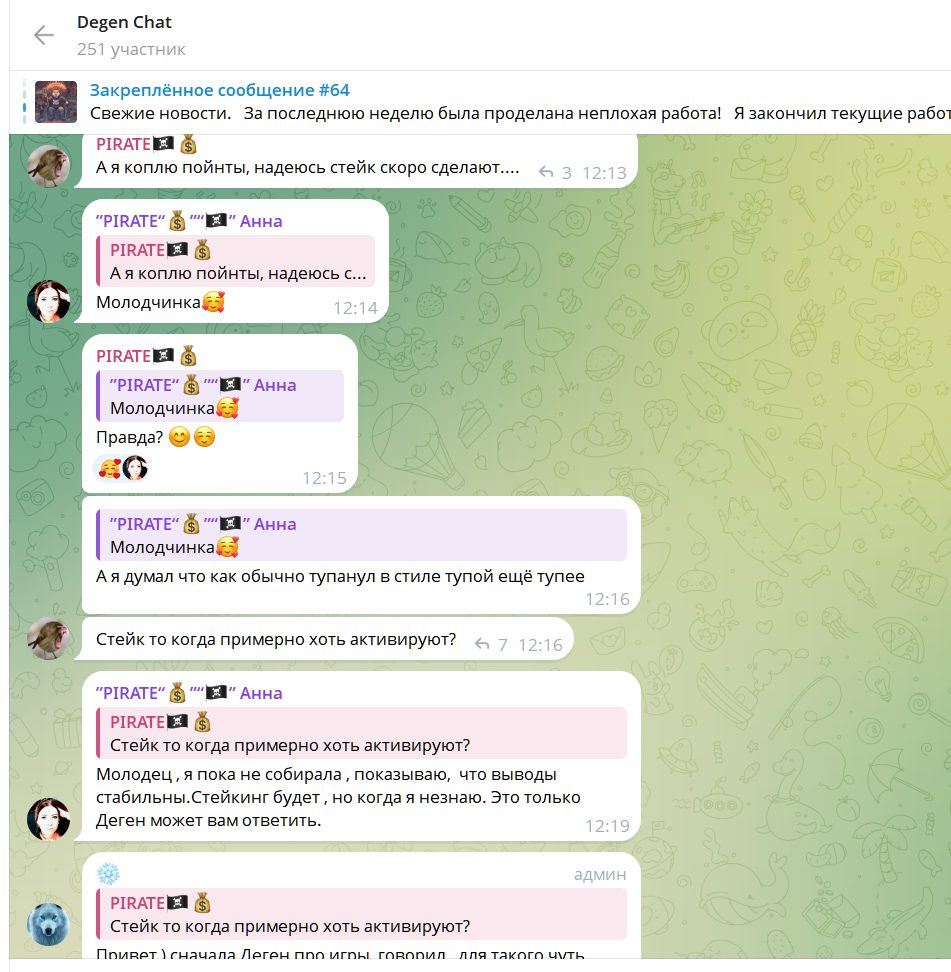 Личность разработчика остается инкогнито. Известен только никнейм админа канала Degen. Пользователей, которые верят, что смогут заработать с этим ботом немного, всего 250 человек. Активно общаются и верят в лучшее те же юзеры, что работали с Pirate cash.