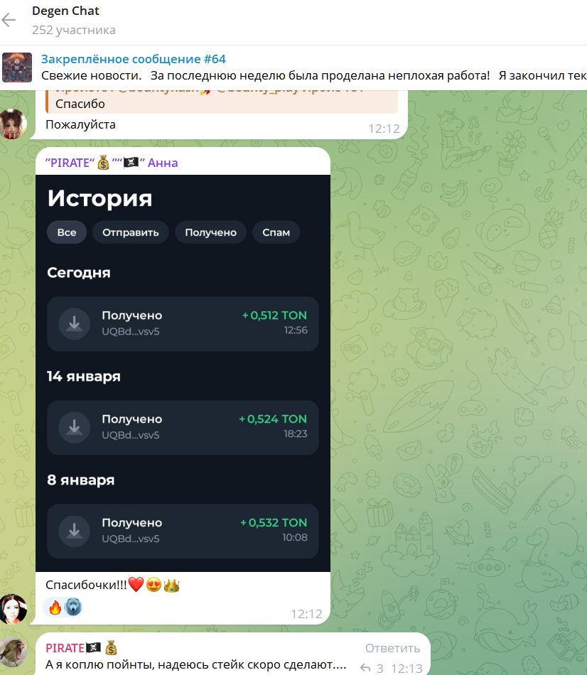 Судя по отзывам, пользователи выводят заработок на TON кошелек Telegram, привязанный к аккаунту бота. Активно фармят внутренние токены пользователи, которые уже зарегистрированы на сомнительных ТГ каналах заработка крипты. Например, про токен Pirate, который невозможно вывести или обменять, есть подробная статья на нашем портале.