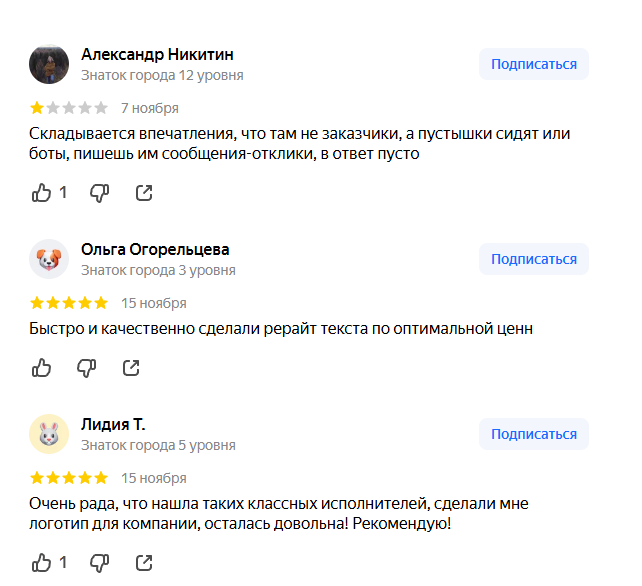 В статистике на сайте указано, что организация сотрудничает со 100 000 исполнителей, но на самом деле цифра в пять раз меньше. Основной минус в том, что ни заказчик, ни исполнитель не имеют рейтинга, не загружают документы, не подтверждают квалификацию, то есть не дают никаких гарантий на надежное партнерство. Из социальных сетей у проекта есть Телеграмм канал с аудиторией 200 человек и страница ВК, на которую подписано около 1700 пользователей. Активности никакой нет, в ТГ последний пост датируется декабрем 2024 года. Комментарии открыты, но в них один спам, который даже не модерируется.