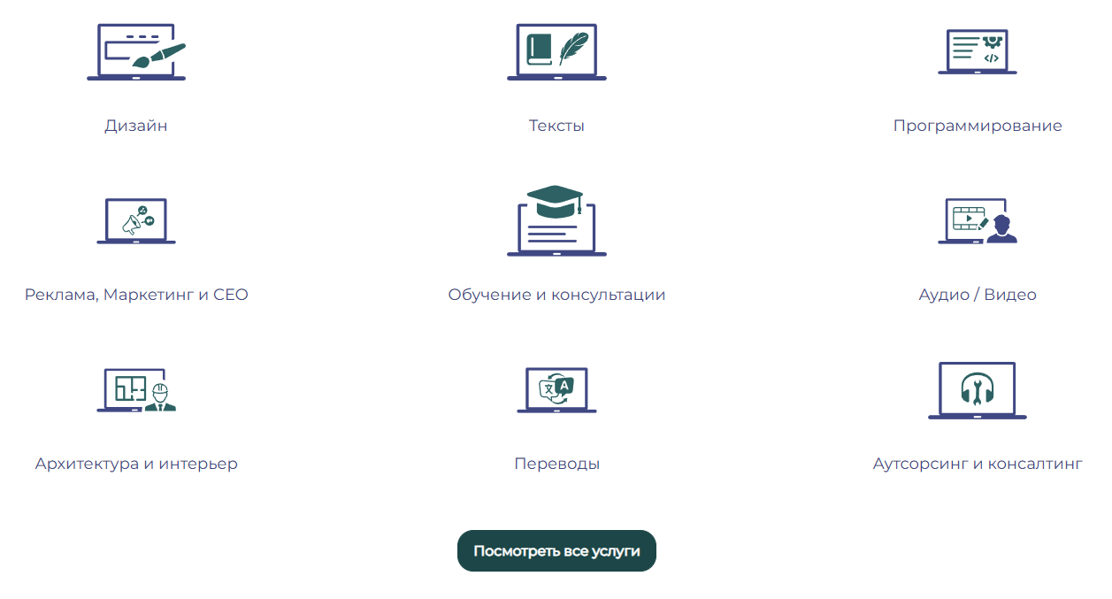 Услуги платформы предоставляются как заказчикам, так и исполнителям, работа ведется в разных категориях, стоимость варьируется: