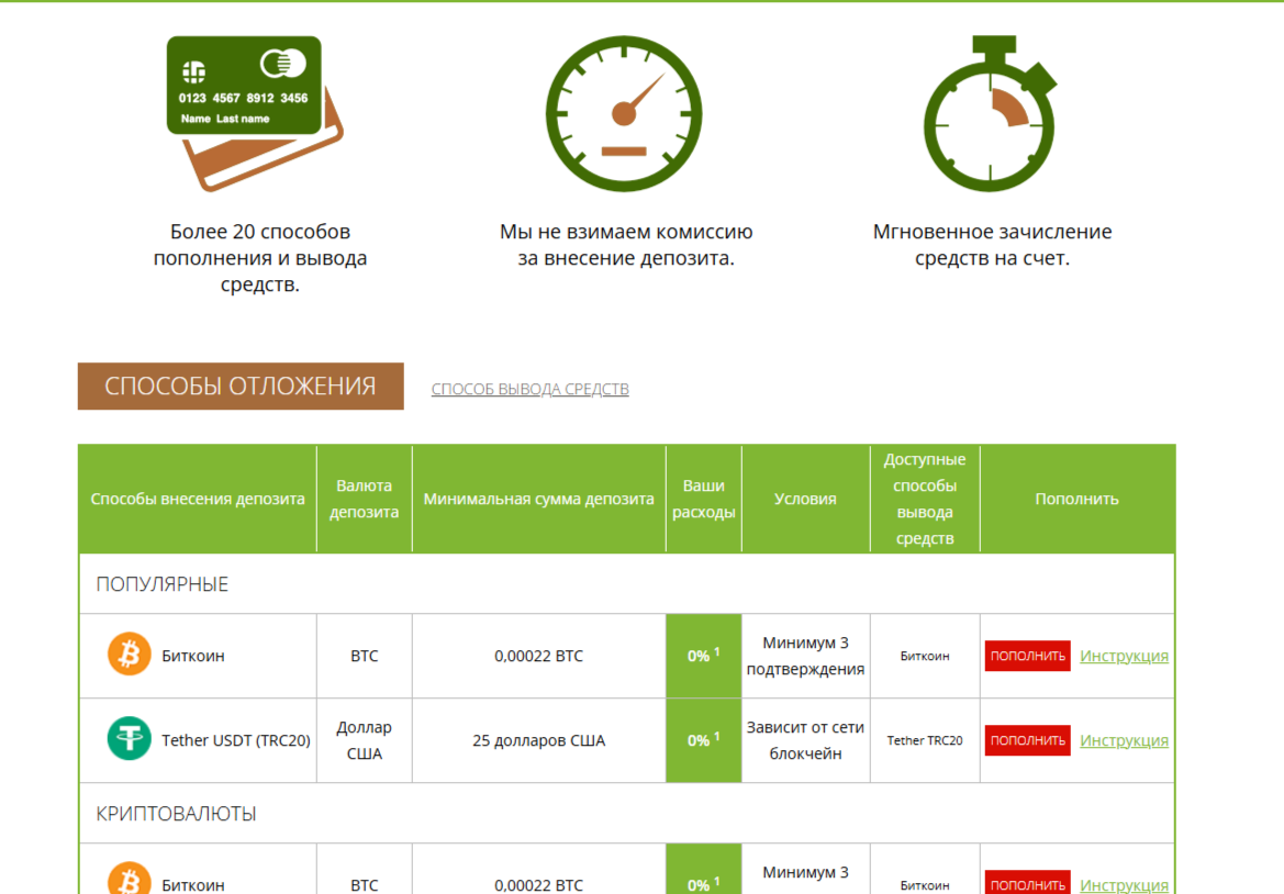 Пополнить счет на веб-сайте freshprofit org трейдеры могут посредством 20+ платежных сервисов. Для совершения транзакций доступны электронные и криптовалютные кошельки, банковские переводы, интернет-банкинг, мобильные платежи. Выводить деньги с личных счетов клиентам брокера следует с помощью сервисов, которые применялись для депозитов.