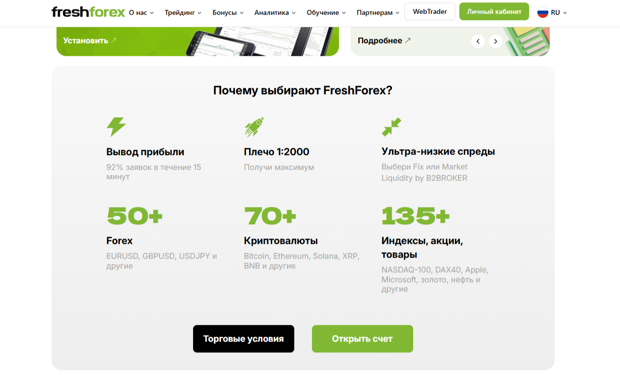 Брокер FreshProfit (FreshForex) предоставляет целевой аудитории возможность бесплатно изучить азы торговли посредством вебинаров, энциклопедии Форекс и других материалов. Клиентам брокерской организации доступны различные акции и бонусы, а также кэшбэк. Своими основными преимуществами посредник считает: