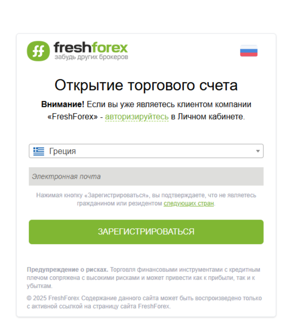 Стать клиентом брокера может житель практически любого государства. Посредник сотрудничает с трейдерами из 158 стран. Для получения доступа к услугам пользователю следует заполнить анкету на веб-сайте my freshreg net. Для открытия торгового счета нужно внести в поля формы, имейл, имя, фамилию, промокод. Далее выбираются параметры аккаунта, завершается регистрация. В личном кабинете клиент проходит верификацию. Осуществляет внесение депозита от 25 долларов.
