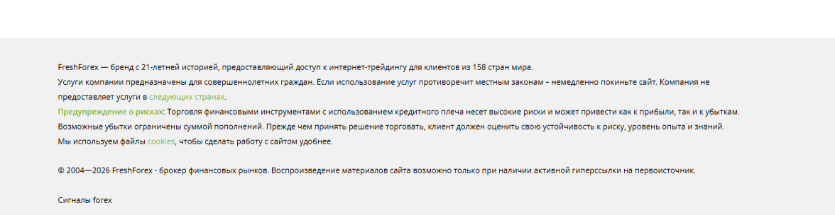 В процессе проверки веб-сайта freshprofit org нами обнаружены интересные факты. Домен нашего брокера был зарегистрирован 24 марта 2026 года. На момент обзора посреднику нет еще и месяца, а значит обманом является информация о стаже работы в 20+ лет. Брокерский сайт не знакомит целевую аудиторию со ссылками на юридические документы и действующие лицензии. В реестрах юрлиц и авторитетных юрисдикций брокер не числится. Деятельность его не регулируется ЦБ РФ.