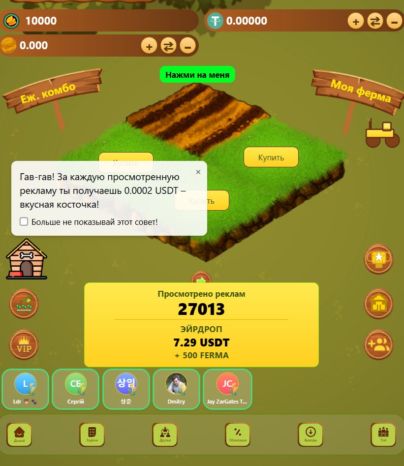 Сравнительно недавно был запущен новый проект — Friend Farm в Телеграмме. Цель игры состоит в сборке урожая и его последующей переработке для получения прибыли. После входа запускается отсчет 12-часового периода, в течение которого клиент получает прибыль.