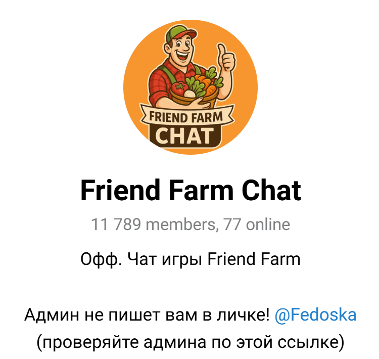 Обсуждение и общение между игроками доступно в чате FriendFarmChat в Телеграмме. На момент написания обзора к нему подписалось около 11,7 тыс. человек, но активность проявляет много меньше пользователей — до сотни. Здесь также указывается профиль администратора — Fedoska.