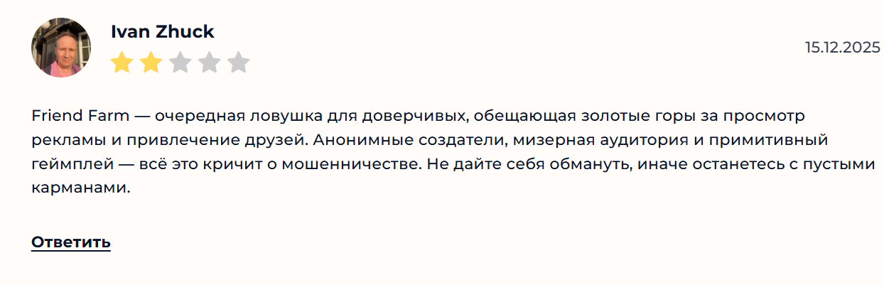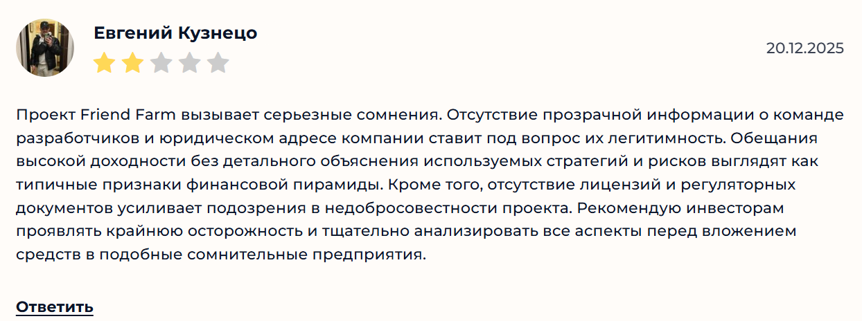В многочисленных отзывах о Friend Farm клиенты отмечают непрозрачность деятельности и отсутствие данных о команде. Отмечается отсутствие детальных стратегий и низкий уровень понимания принципов игры.