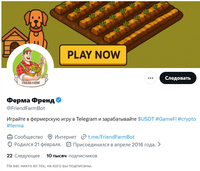 Стоит отметить наличие профиля FriendFarmBot в Твиттере. На начало 2026-го к этому сообществу подписалось уже 10 тыс. человек. При этом новые публикации не добавлялись практически два месяца.