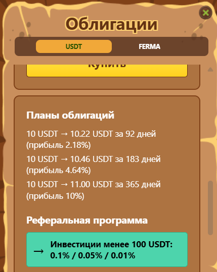 После входа в FriendFarmBot появляется большое игровое поле. Пользователям сразу предлагают вложить деньги в облигации и получать пассивный доход. На выбор доступен вариант с использованием токенов USDT и ферма.