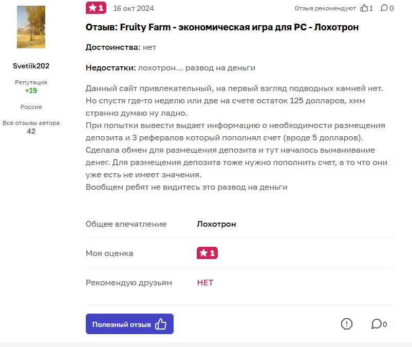 Мы не рекомендуем регистрироваться, вносить деньги или покупать рефералов в Fruit Farm Game. Если вы уже участвовали в проекте, поделитесь своим опытом в комментариях.