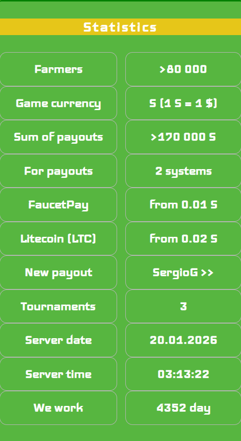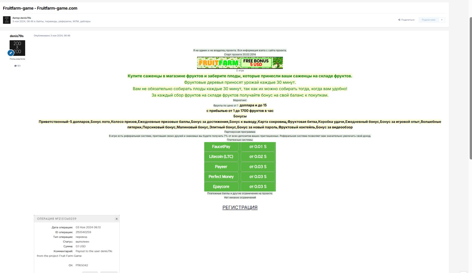 Fruit Farm Game является экономической игрой, якобы с гарантированным заработком без вложений. Проект работает с 2014 года и обещает стабильные выплаты, а также реферальную систему. Но за подобными заявлениями скрывается пирамида, где реальный заработок получают только администраторы.