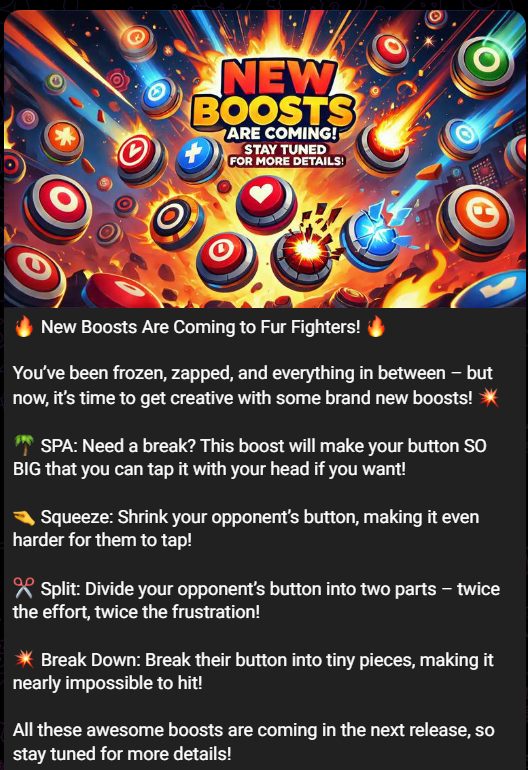 В Fur Fighters присутствуют усилители, которые активируются за накопленные монеты. Апгрейды позволяют увеличивать доход от тапов, снижать затраты энергии или ускорять восстановление: